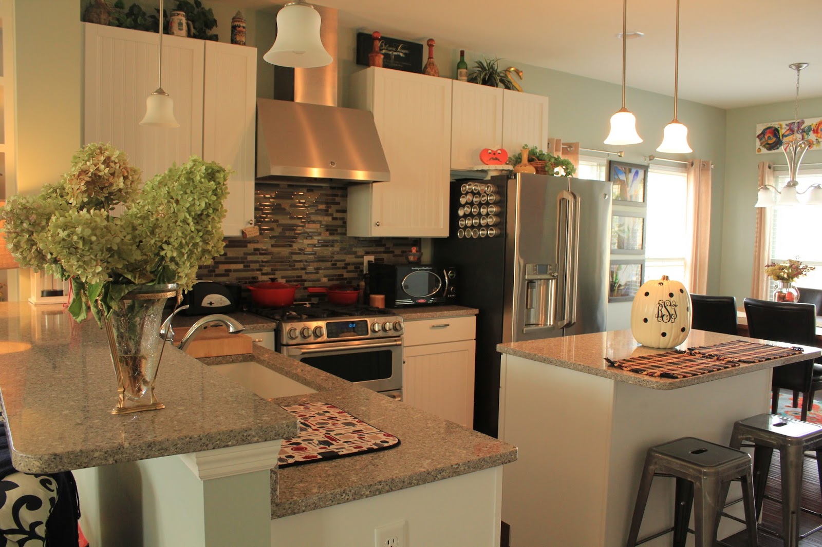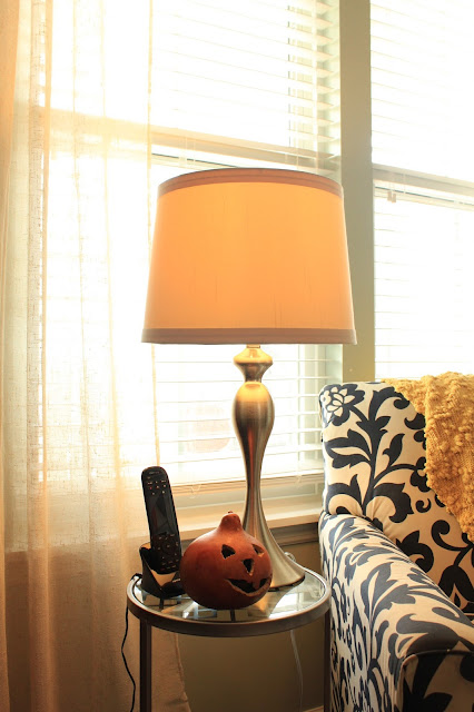 The kitchen doesn't have a lot of Halloween decor but I try to make the pieces count. On top of the refrigerator is a wood pumpkin my dad cut and painted. His snarly face is so very Halloween! The white pumpkin on the island was made by me last year at our neighborhood Pinterest Party.