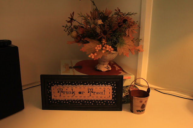 My living room is very small. The largest piece of furniture is a love seat. It suits my husband and me fine, except for entertaining. I am learning how to entertain on a much smaller scale! Do you see the little scrapbook on the trunk? It is full of Halloween pictures of my daughter. She turns 30 this month!