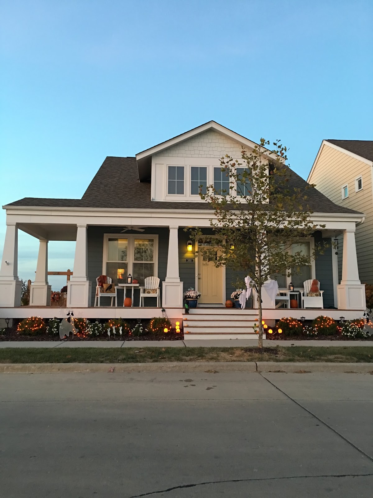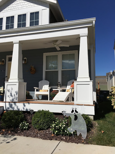 | The front of the house, with its ghosts and pumpkins! |