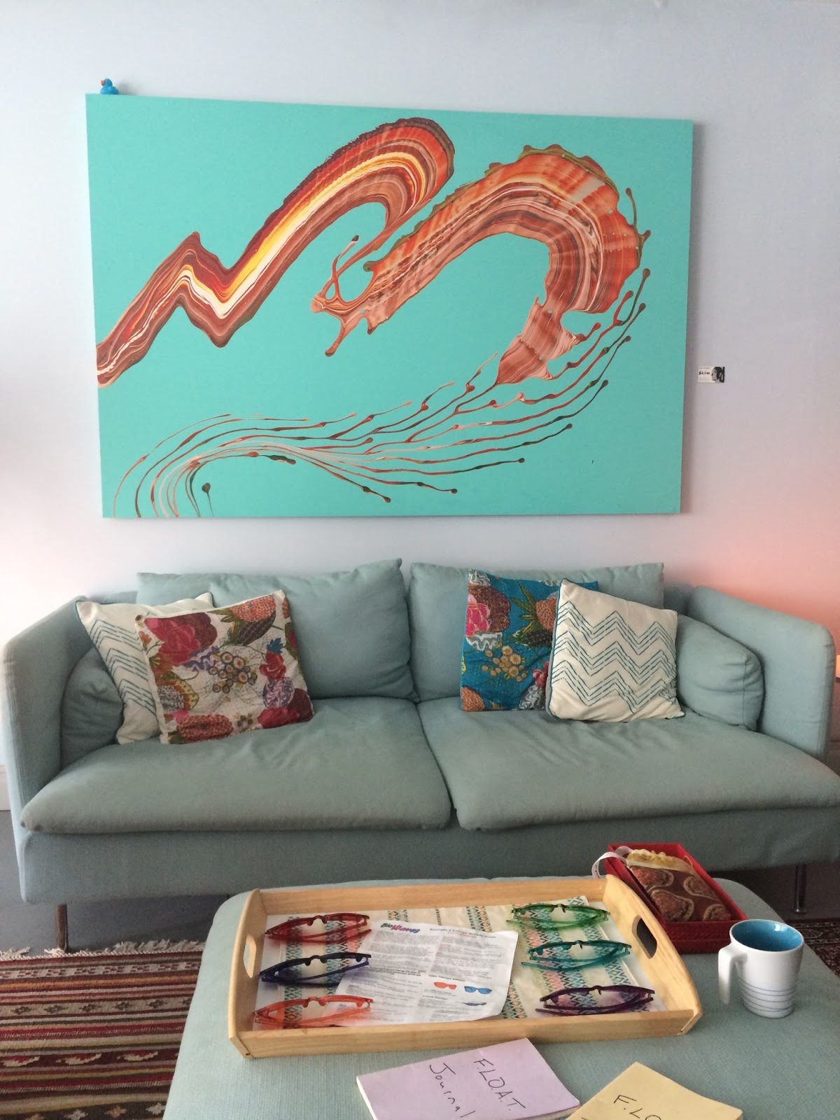 When you arrive, you remove your shoes and sit down in a space designed to calm you. Comfy chairs and sofas, beautiful art and warm music float around you. The time comes for you to float, you are escorted into your room, where you shower with a fabulous rainshower and special bath products. You step into the tub, close the door (if you want), turn out the lights (if you want) and float.