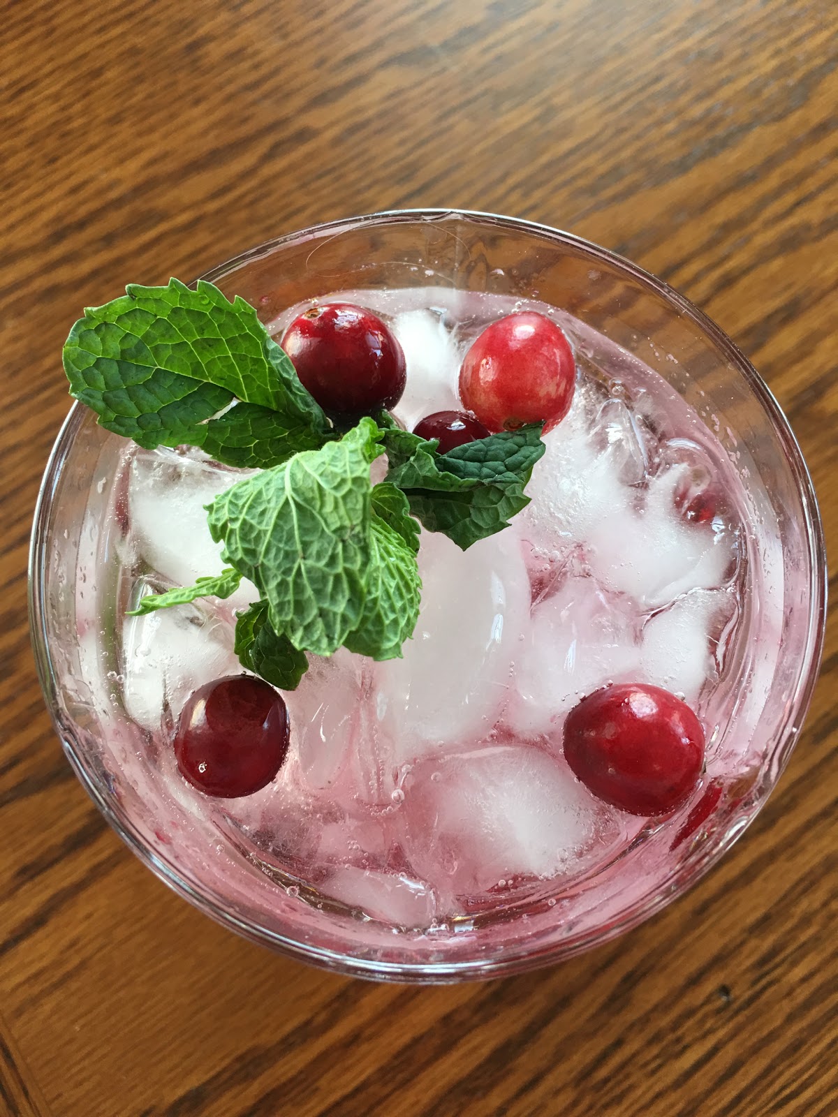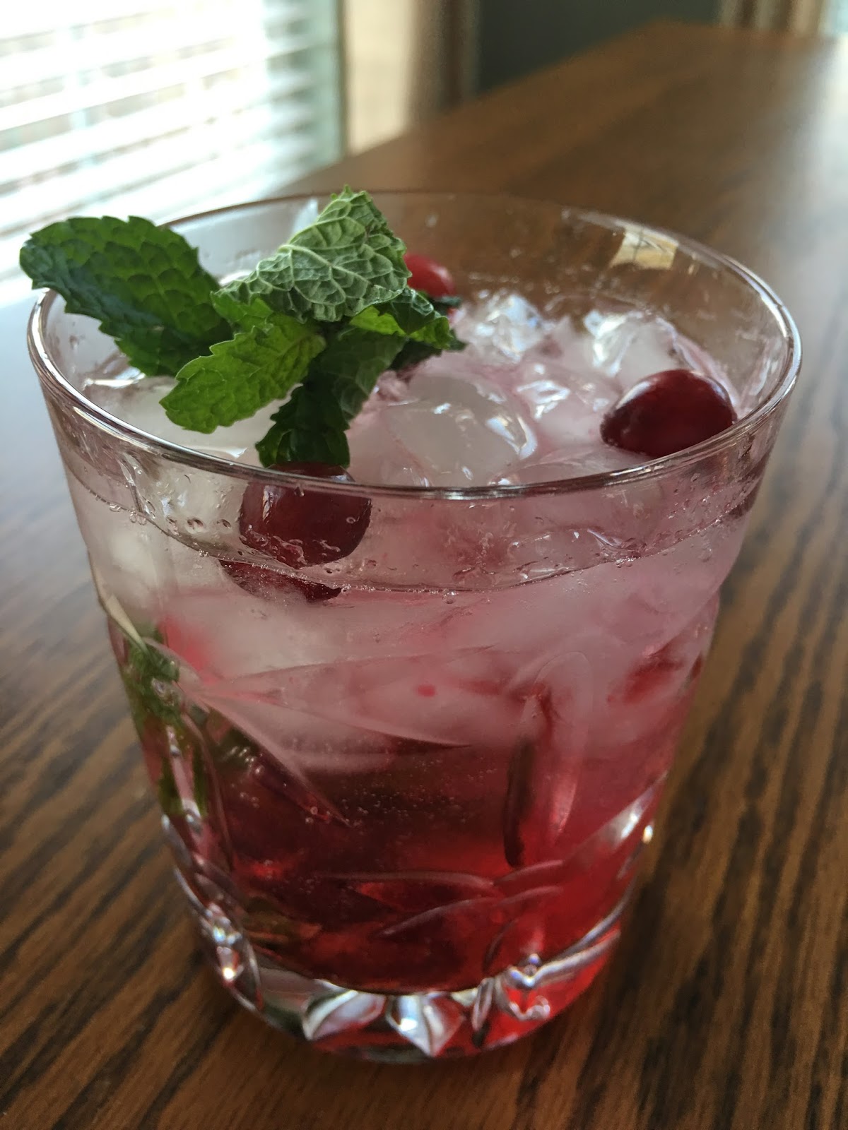 To make the cocktail: Muddle 10 mint leaves with 1 T lime juice in an old fashion glass (that's a type of cocktail glass.) Just enough to break the leaves to release their oil but not so much that you can't tell it is a mint leaf! Add crushed ice. Mix together 2 oz of cranberry syrup and 2 oz of cranberry vodka (Burnett's makes some). Pour into glass. Top with soda water. Garnish with mint and fresh cranberries. Serve.