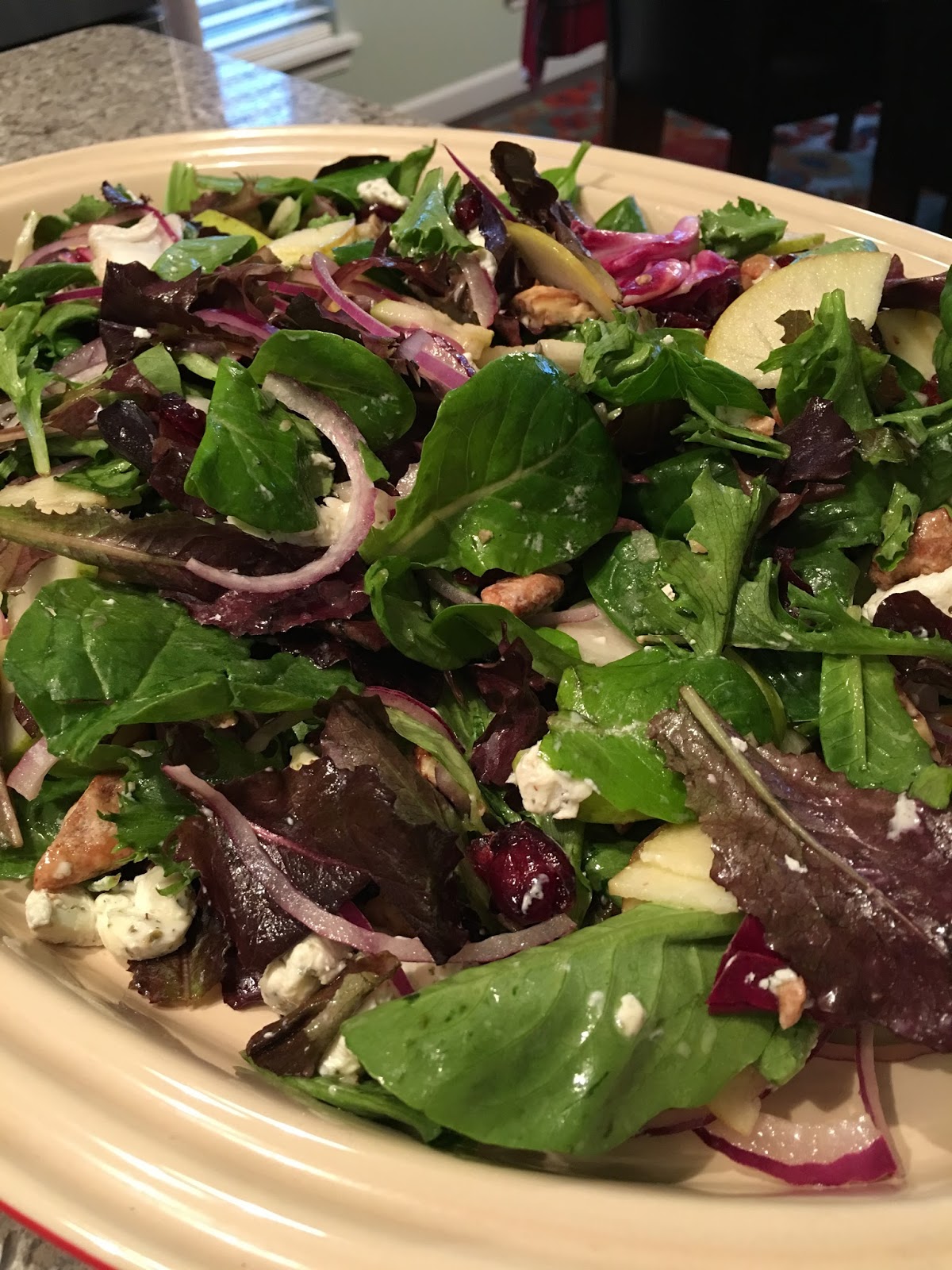 | Greens, goat cheese, red onion, dried cranberries, candied pecans, pears and apples with a roasted citrus vinagrette |