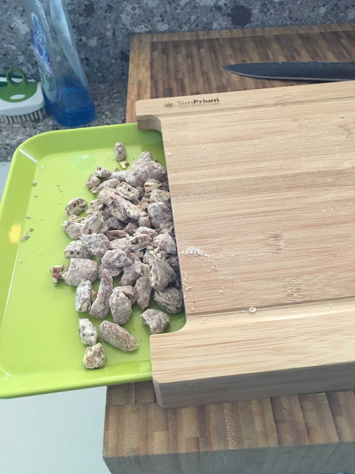 This is the neatest cutting board I have ever used, and it has become my go to chopping board, even though I have a perfectly good chopping block sitting on my countertop. Why? That green sliding tray. You can chop, scoop all your veggies into the tray and keep on chopping. I love it. It's priced at $30 on Amazon.